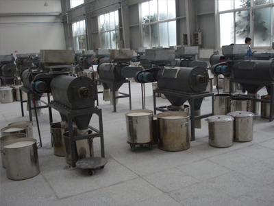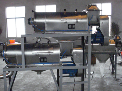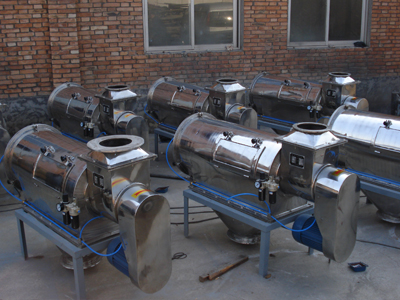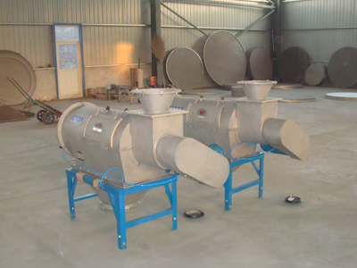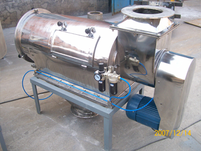 本設(shè)備篩網(wǎng)為圓筒狀,置于機(jī)體內(nèi),物料通過螺旋輸送系統(tǒng)后,和氣流混合、霧化進(jìn)入網(wǎng)筒內(nèi);通過網(wǎng)筒內(nèi)風(fēng)輪葉片使物料同時(shí)受離心力和旋風(fēng)推進(jìn)力,從而迫使物料噴射過網(wǎng),由細(xì)料排出口排出,不能過網(wǎng)的物料沿筒壁從粗料排出口排出。